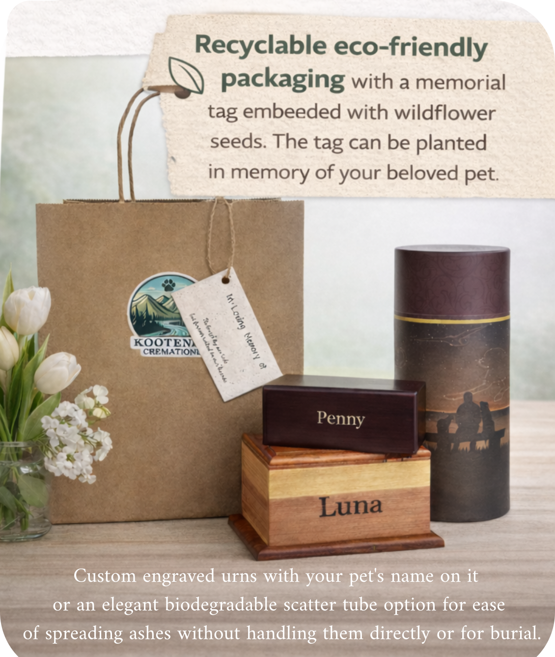 Our Standard private cremation includes a custom-engraved wooden urn or an elegant scatter tube, returned with your pet’s ashes within one week. Since our urns are always available and engraved by us, there are no extra wait times for families.